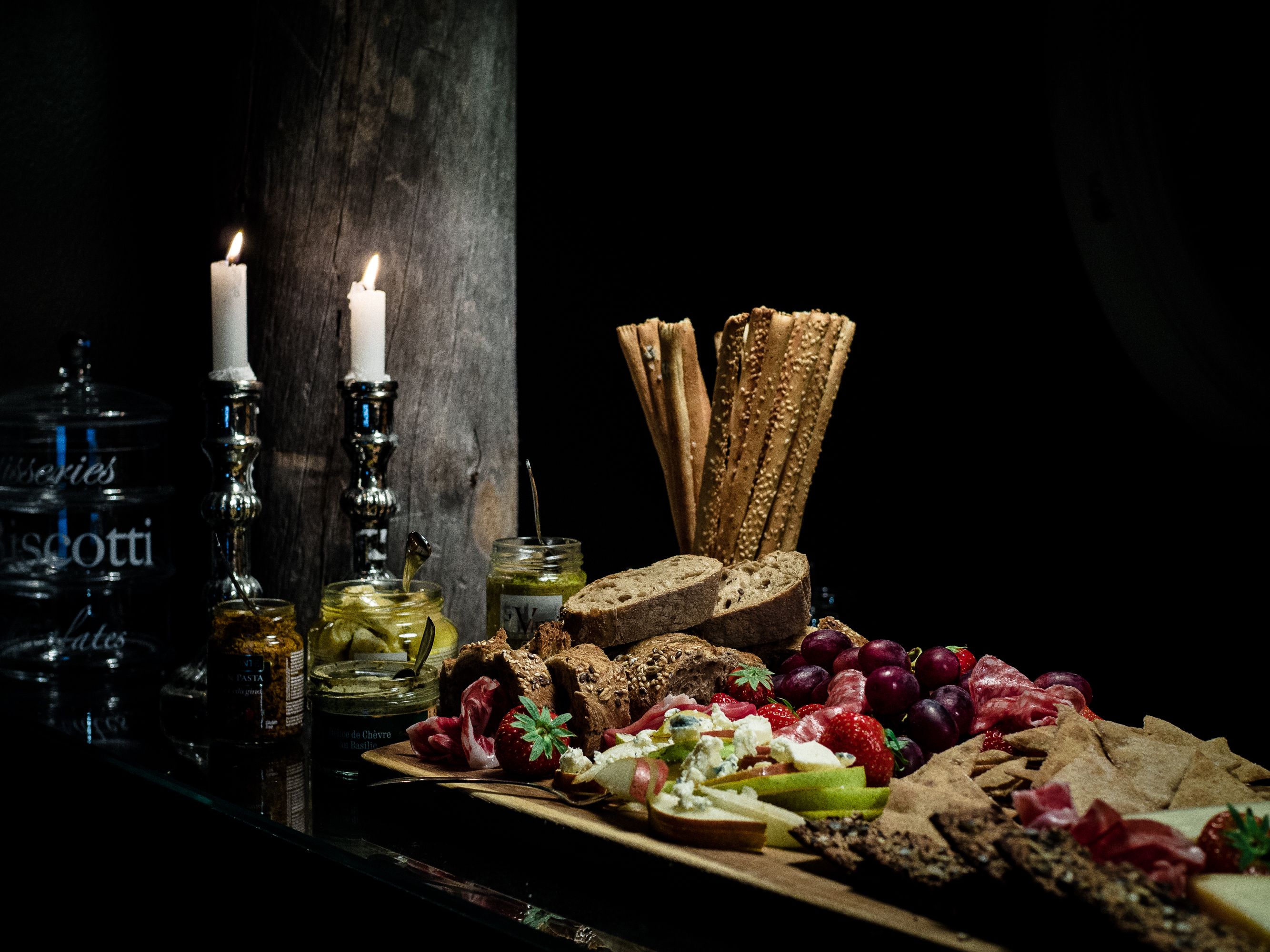 Tämän perjantain ruoat ovat siis helpoimman kautta. Purkista ja suoraan pöytään. Ja tiedättekö, sekin on välillä ok. Ei tarvitse olla mitään ihmeellisyyksiä. Pääasia, että sitä on, eiks niin? Käytiin Stockalla ja ostettiin muutamia juustoja, oliivitapenadea, oliivi-kirsikkatomaattitahnaa, chevre-basilikatahnaa, latva-artisokkaa ja leipätikkuja. Tuoretta patonkia, hummusta ja kurkkua sekä muutamia leikkeleitä. Päärynäviipaleiden päälle murustelin sinihomejuustoa. Tapaslautasta raikastamaan laitoin viinirypäleitä ja mansikoita. Juustojen kylkeen viikunahilloa. Laseihin täyteläistä punaista.