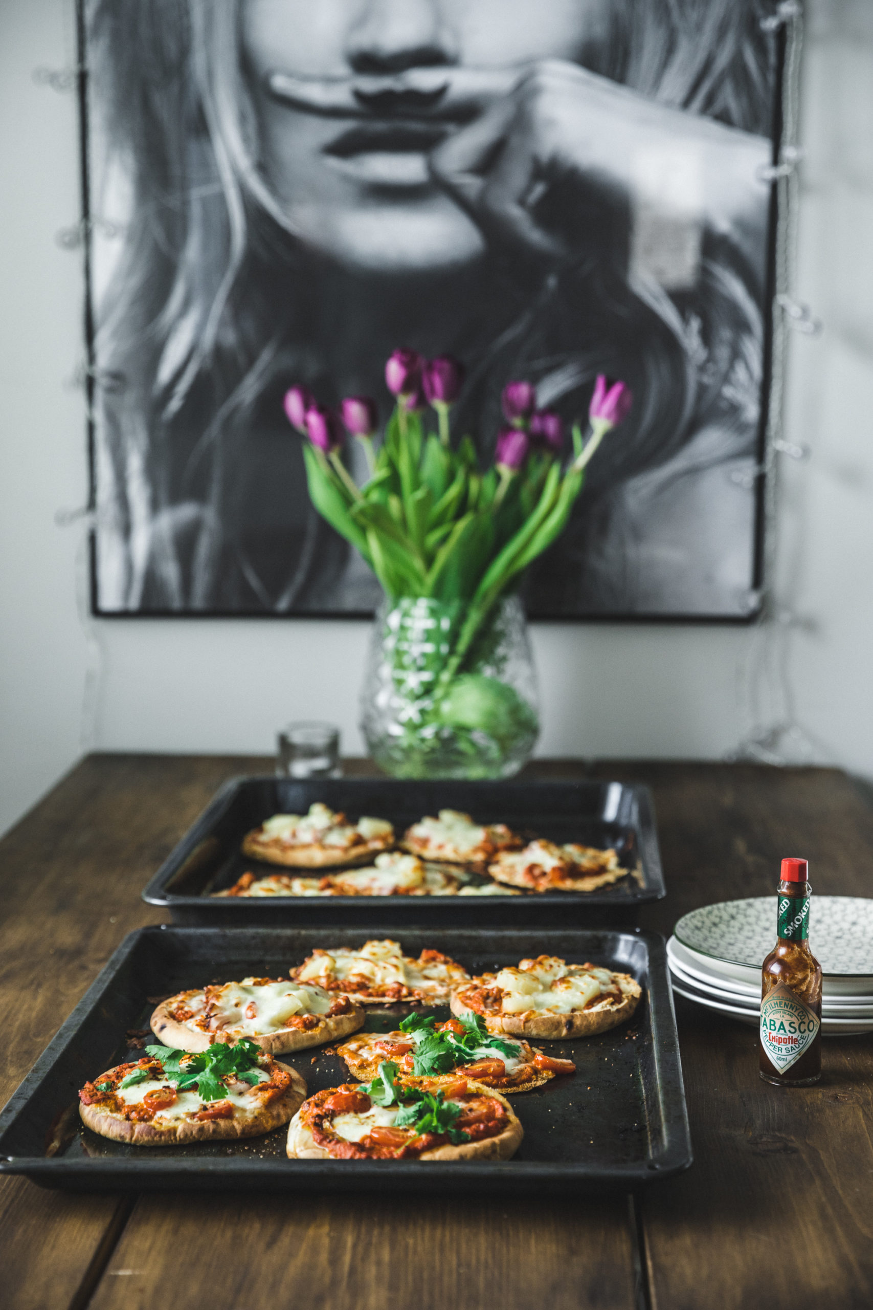 Yleensä mun kauppalistoissa on sellaisia aineita, joita voi hienosti yhdistellä keskenään, mikäli joku päivä ei ihan hontsita pysyä suunnitelmassa (oon muuten huomannut, että näitä päiviä on ollut nyt aika usein). Tänään lauantaina meillä oli vönerpitaleipien sijaan pitapizzoja.